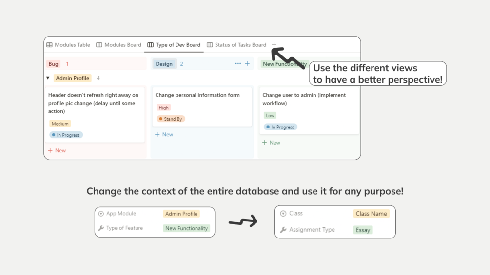 Whether you are a software engineer, a graphic designer, a marketing professional, a student, etc. keeping track of your tasks can be complicated if you don't have one place to manage them all. With this template you can do that an MORE! Thanks to the power of Notion databases, this product allows you to add, edit or delete activities from the different views so you know what's happening in your workflow. Use the configurations for each view to display only the crucial details of each task so you can focus on finish them off; complete the inputs with your studied field topics and start adding your assignments.