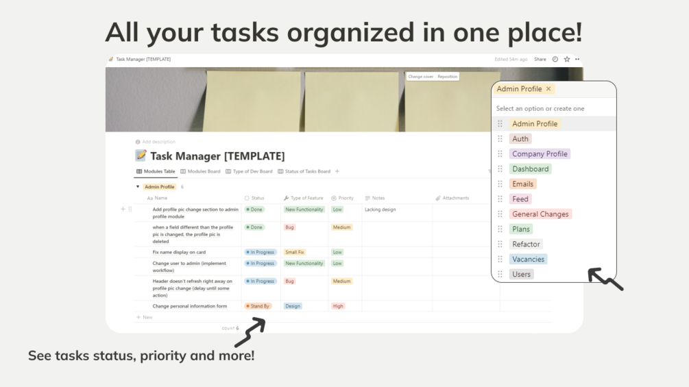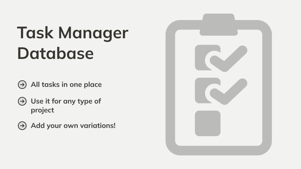 Task Manager Database is a template to display all your tasks in a way you can easily find everything you need on a daily basis to finish your job in time.